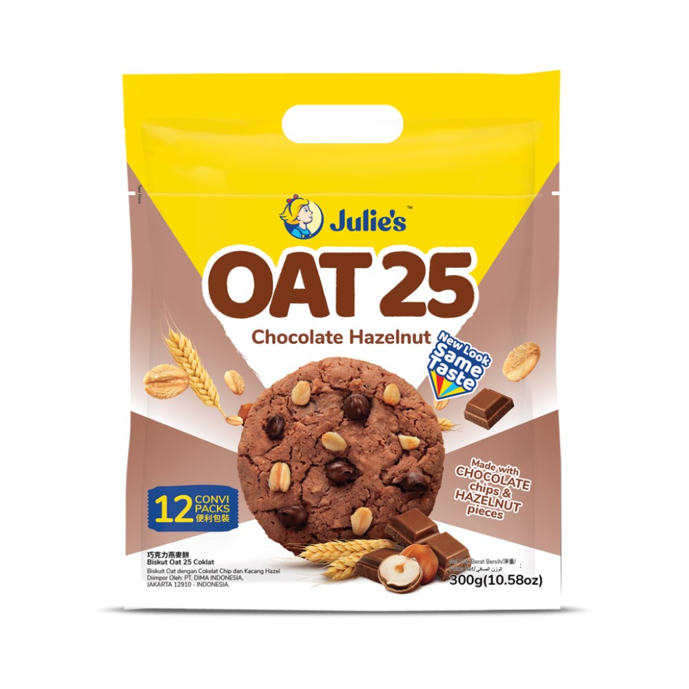 Julie's Oat 25 Chocolate 300g Crunchy chocolate cookies made with wholesome oatmeal, sprinkled with hazelnuts and dark chocolate chips that melt in the mouth, OAT 25 Chocolate Hazelnut will impress even non-chocolate lovers in no time with its rich dark chocolaty spike and a subtle hint of hazelnut amid the sweet chocolate cookie base. Size : N/A Origin Country Malaysia RM 7.90 /1pack Market Selling : RM 8.60 Bulk Saving : RM 0.70 / 8.14% Quantity Share99 Products : 504